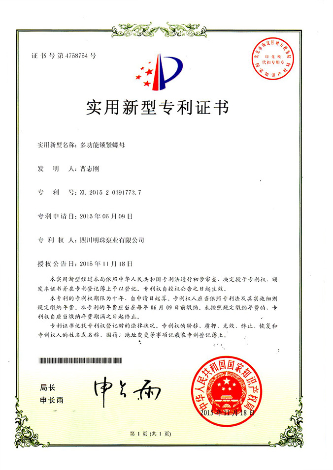 《多功能锁紧螺母》实用新型专利证书