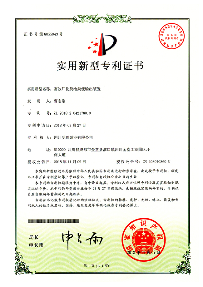 《畜牧厂化粪池粪便输出装置》实用新型专利证书