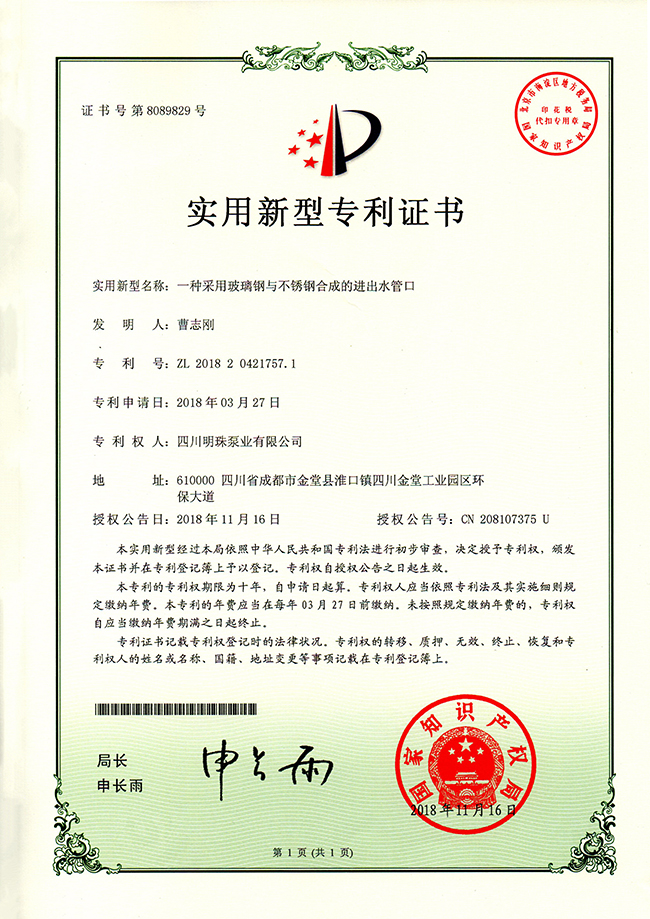 《一种采用玻璃钢与不锈钢合成的进出水管口》实用新型专利证书